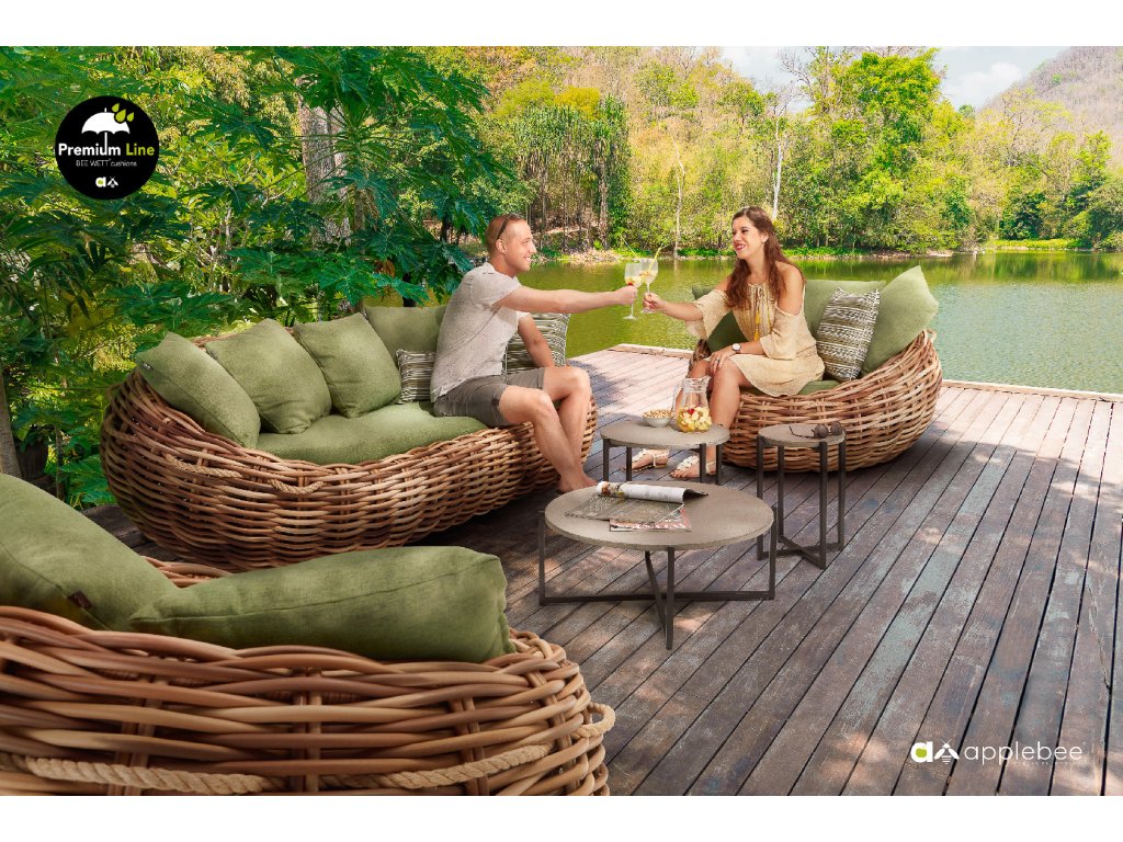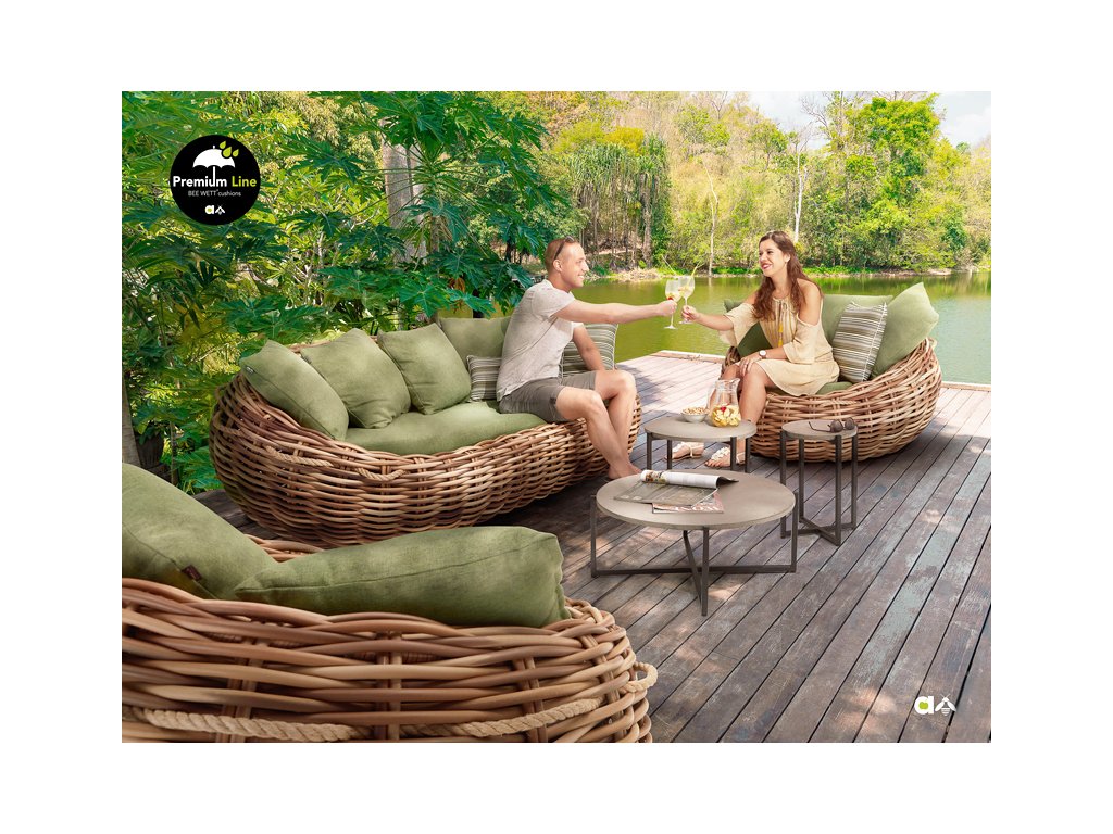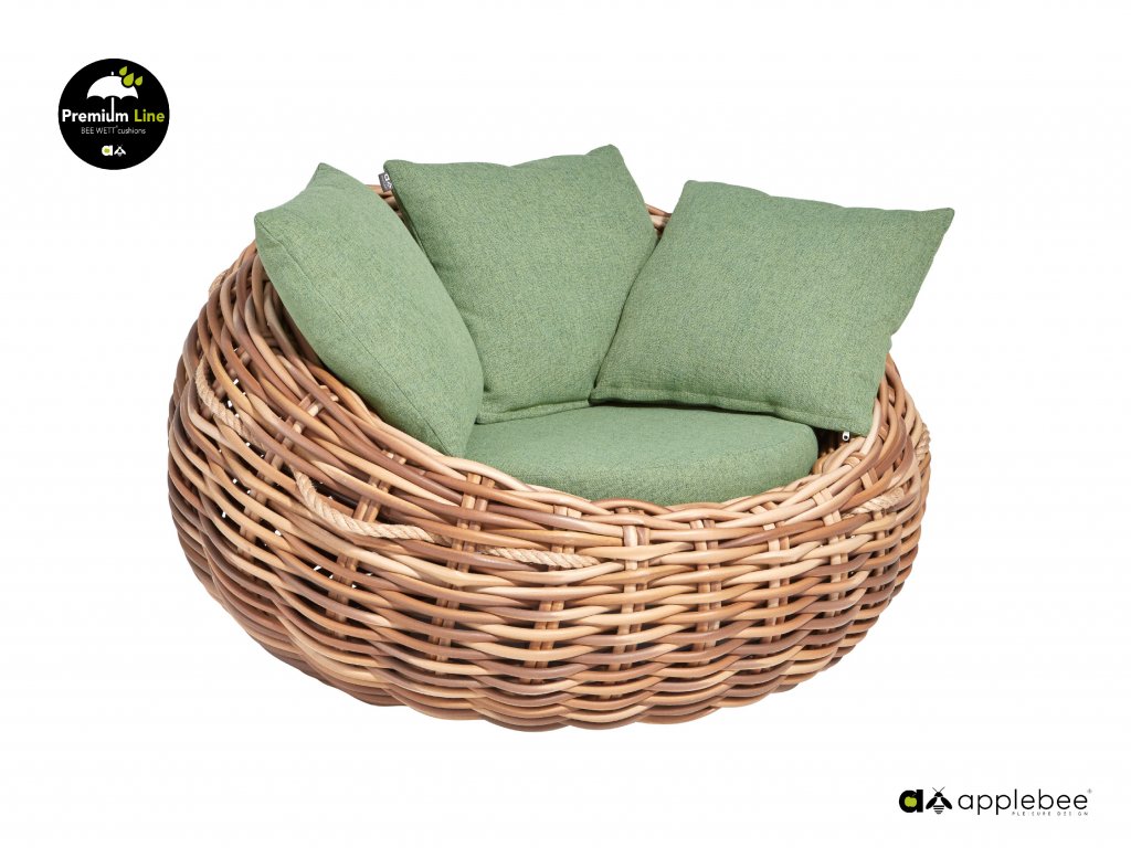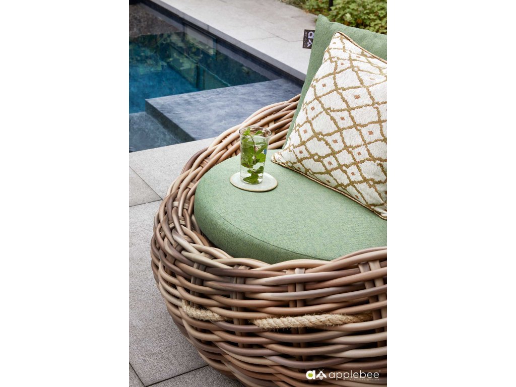 Křeslo Cocoon 130 x 130 x 69 cm, rám aluminium, Biculair® výplet v barvě Mocca (20 mm), BeeWett® polštáře v zelené barvě