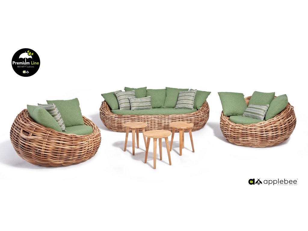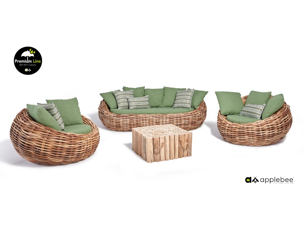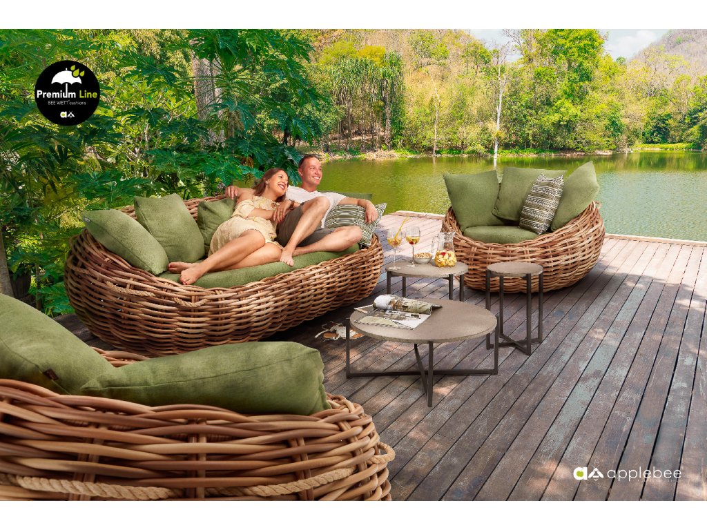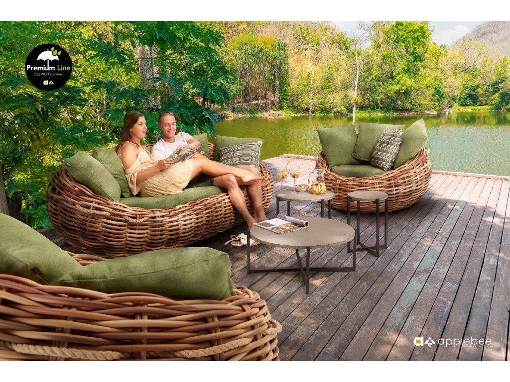 Křeslo Cocoon 130 x 130 x 69 cm, rám aluminium, Biculair® výplet v barvě Mocca (20 mm), BeeWett® polštáře v zelené barvě