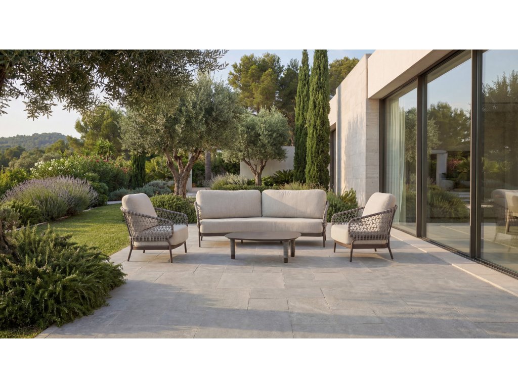 Juno sedací souprava kombinuje rafinovaný kovový rám s ručně tkaným lanem, čímž vytváří otevřený a vzdušný vzhled. Je ideální pro ty, kdo hledají stylový a funkční nábytek do zahrady.