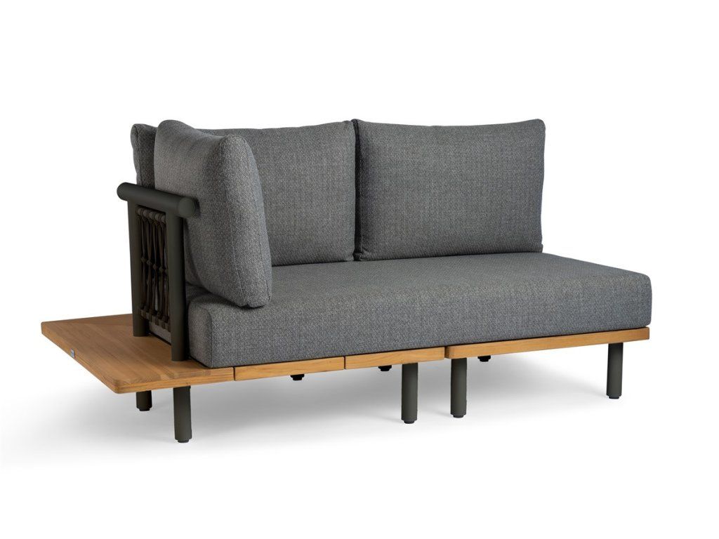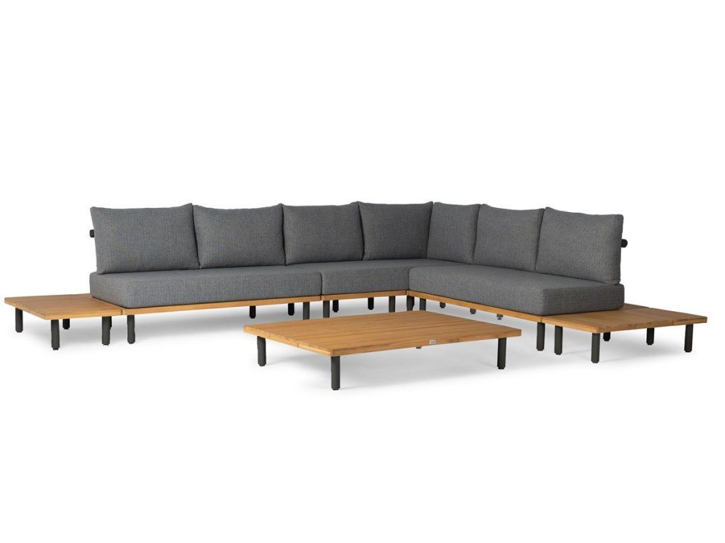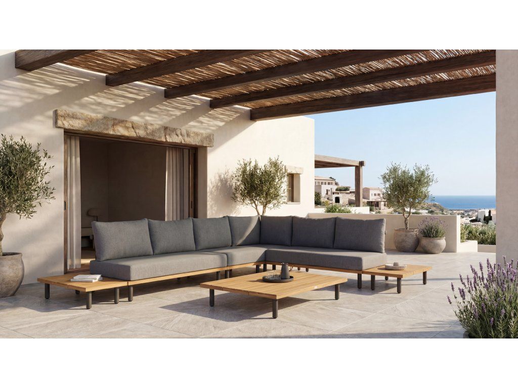 Tato sada vyzařuje klid a eleganci díky lehkému rámu a teplým dřevěným akcentům. V zadní části dodává zjemněné olefinové lano vzdušný, ručně vyrobený detail, který design jasně umocňuje. Velkoryské polštáře čalouněné olefinovou látkou dodávají celé sadě pohodlný a příjemný pocit – ideální pro stylovou zahradu.