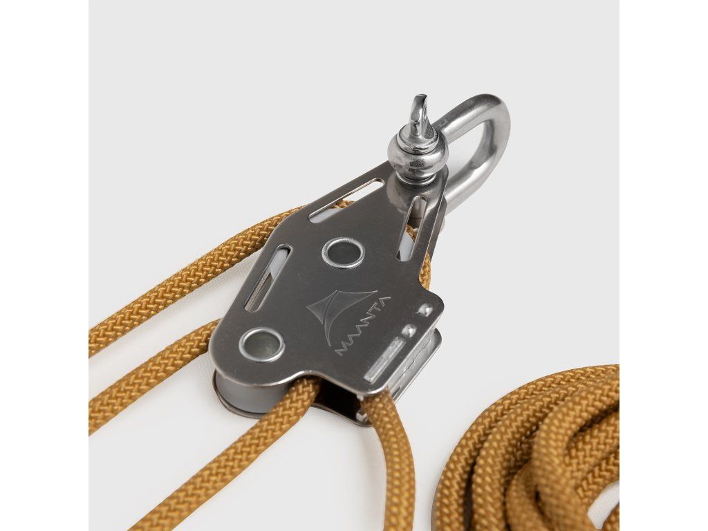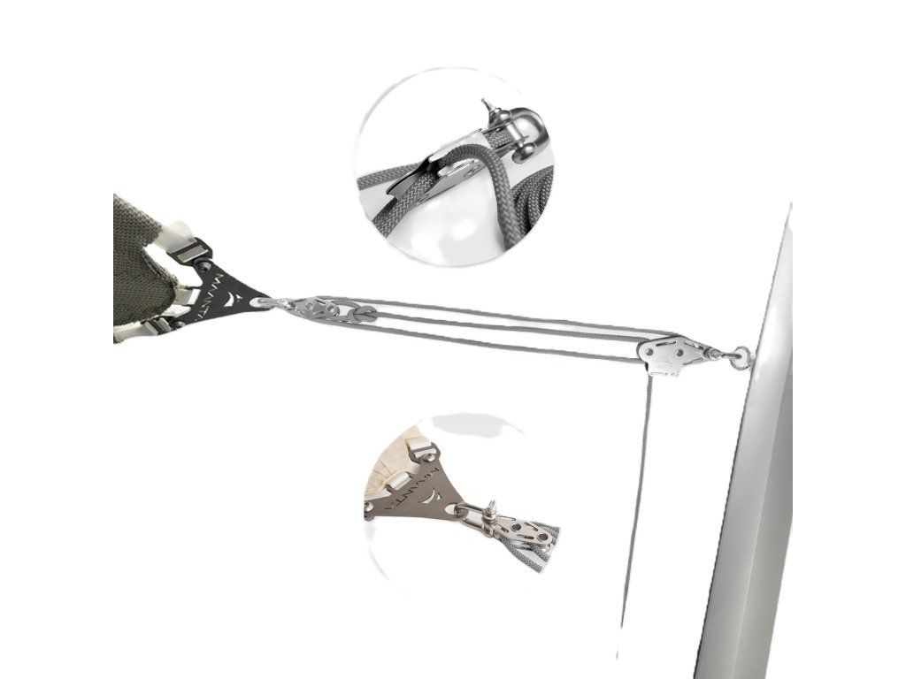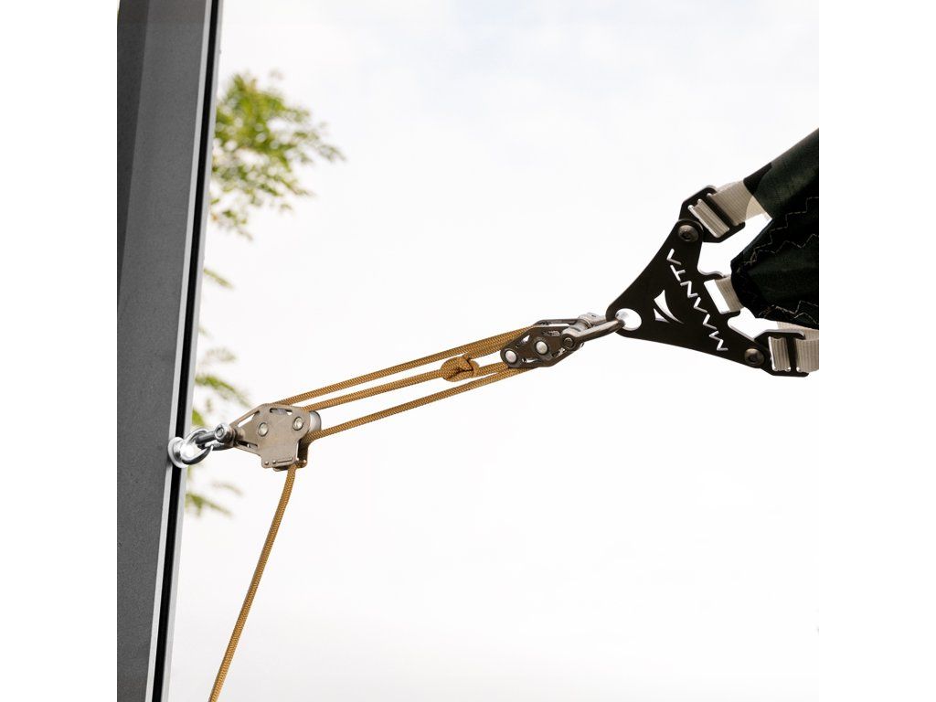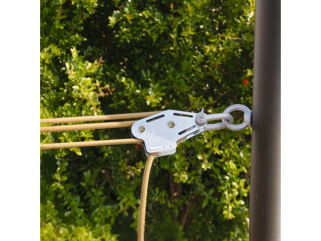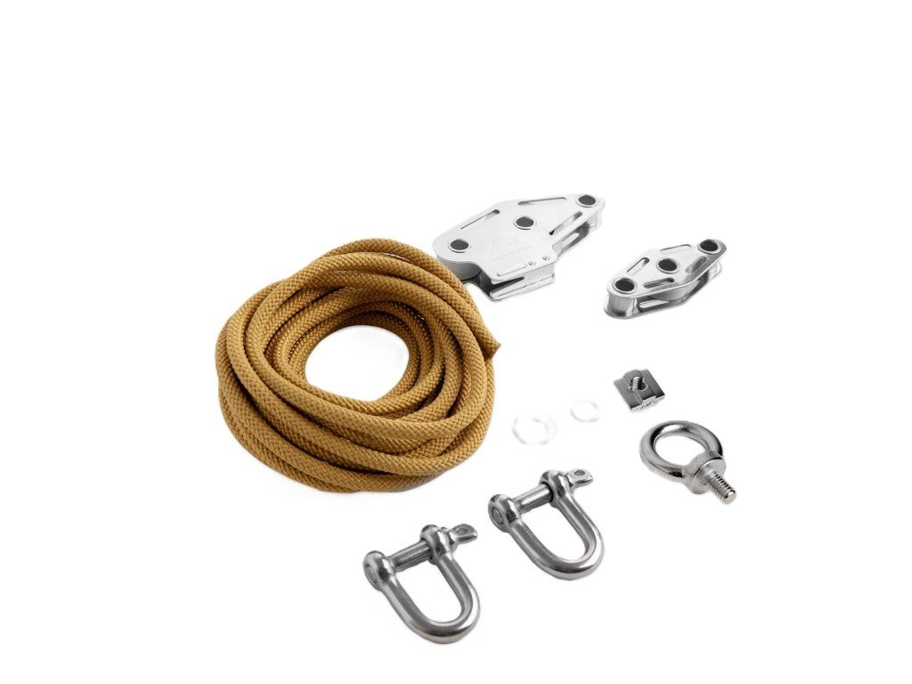 Sada Muscle dokáže ztrojnásobit sílu působící na vlasec díky mechanickému náskoku kladek. Je to jednoznačně nejúčinnější systém pro napínání stínicí plachty, aby byla bezpečnější proti větru a lépe odváděla dešťovou vodu. Je specifický, ale snadno se instaluje.