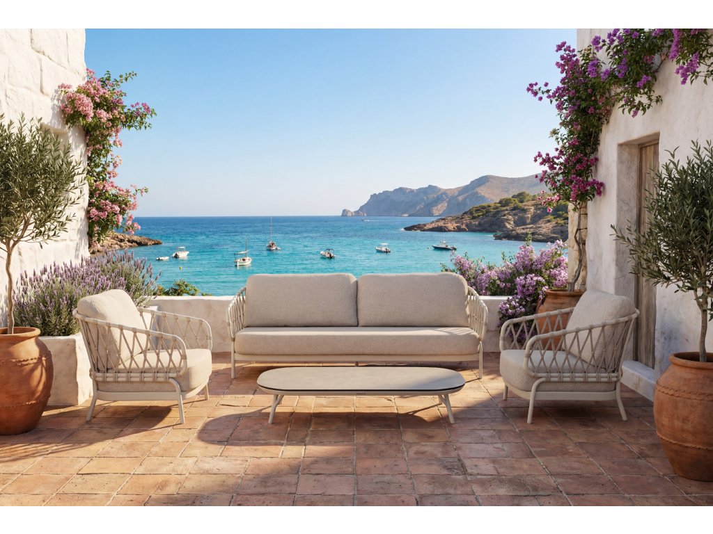 Tato sedací souprava kombinuje lehký rám s rafinovanými lanovými detaily, což zahradě dodává klidný a vzdušný vzhled. Samostatná pohovka a křesla umožňují flexibilní uspořádání s dostatkem pohodlí. Polštáře jsou čalouněny olefinovou látkou a jsou na dotek měkké, zatímco konferenční stolek, který k ní patří, dodává celé sestavě dokonalou rovnováhu.