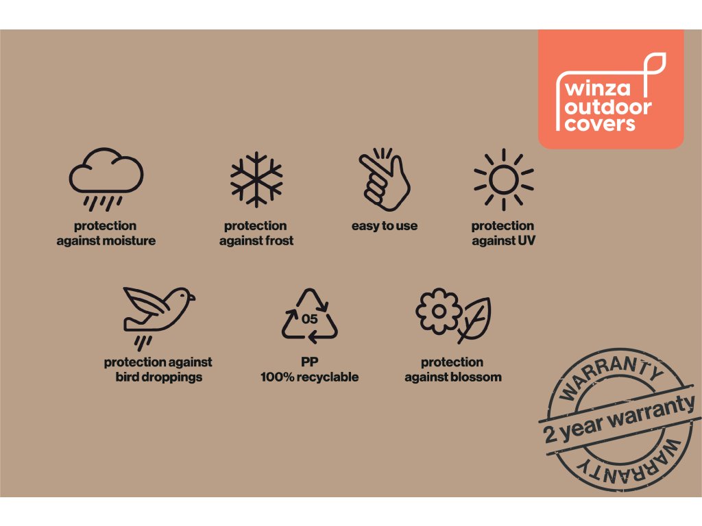 Ochranný obal je vyrobený z luxusní a odolné PP textílie s povrchovou úpravou a je nepromokavý (včetně švů), odolný vůči UV zářeení a barevně stály.