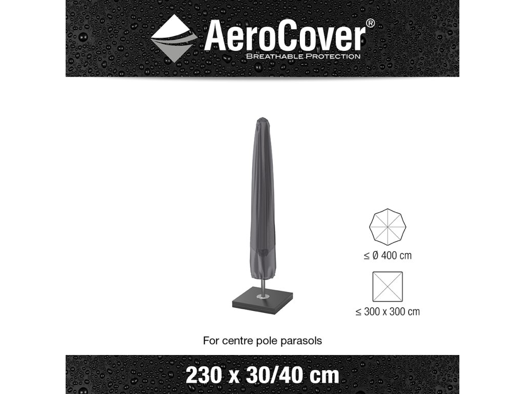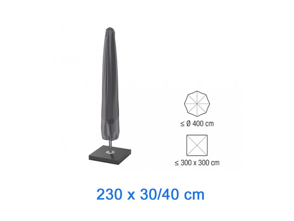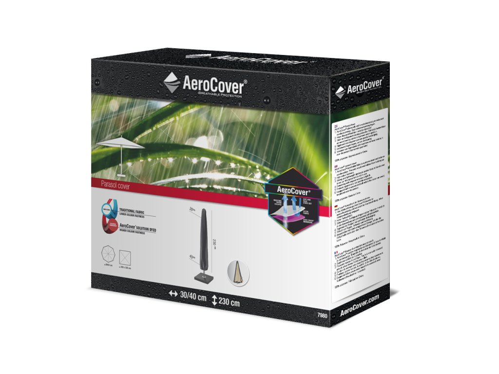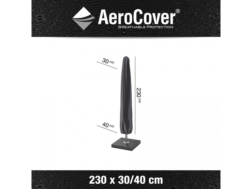 S rozměry 230x30/40 cm je obal Aerocover vhodný pro většinu lampových slunečníků. Snadno se nasazuje a utahuje pomocí zipu a popruhů, což zajišťuje pevné uchycení i v silnějším větru.