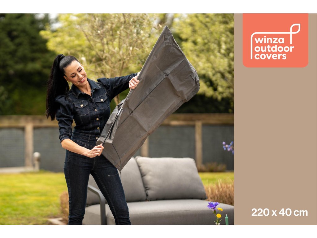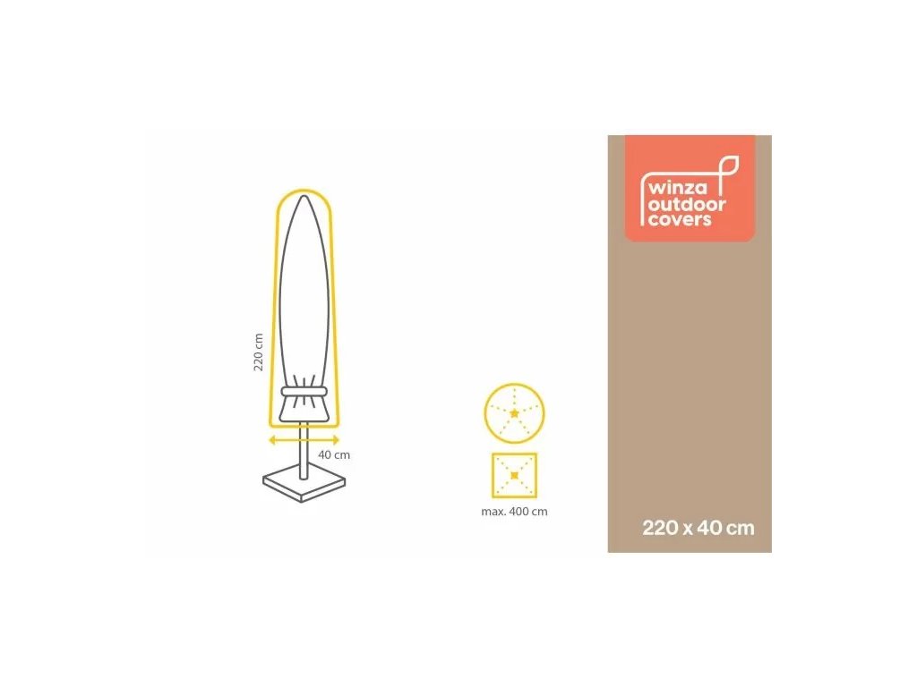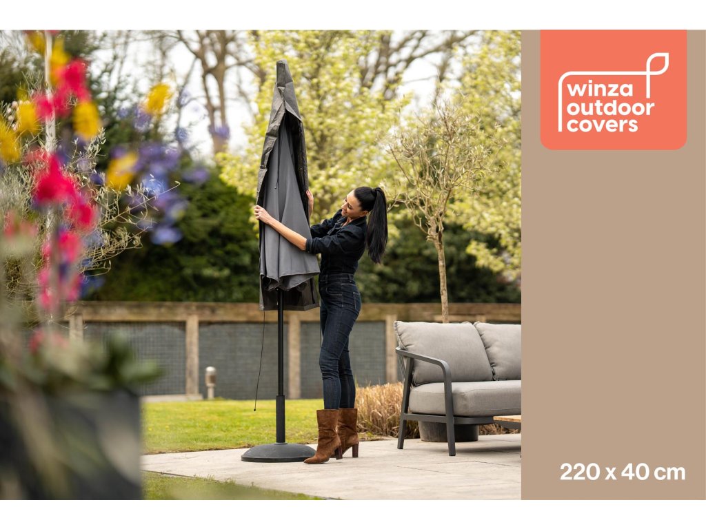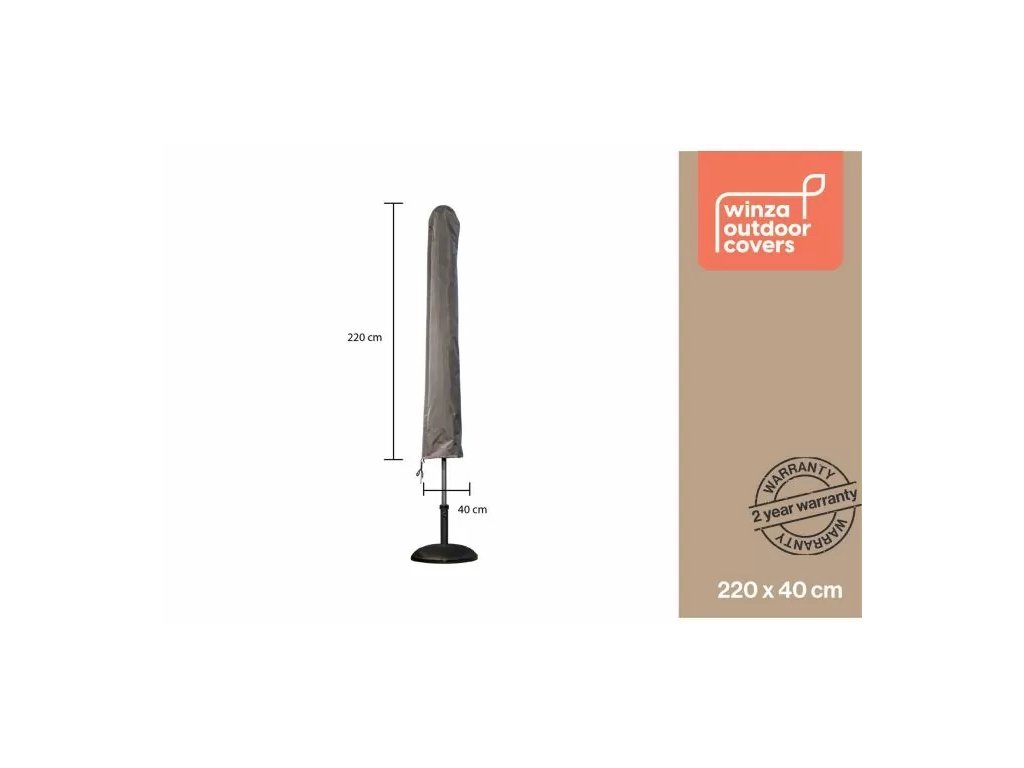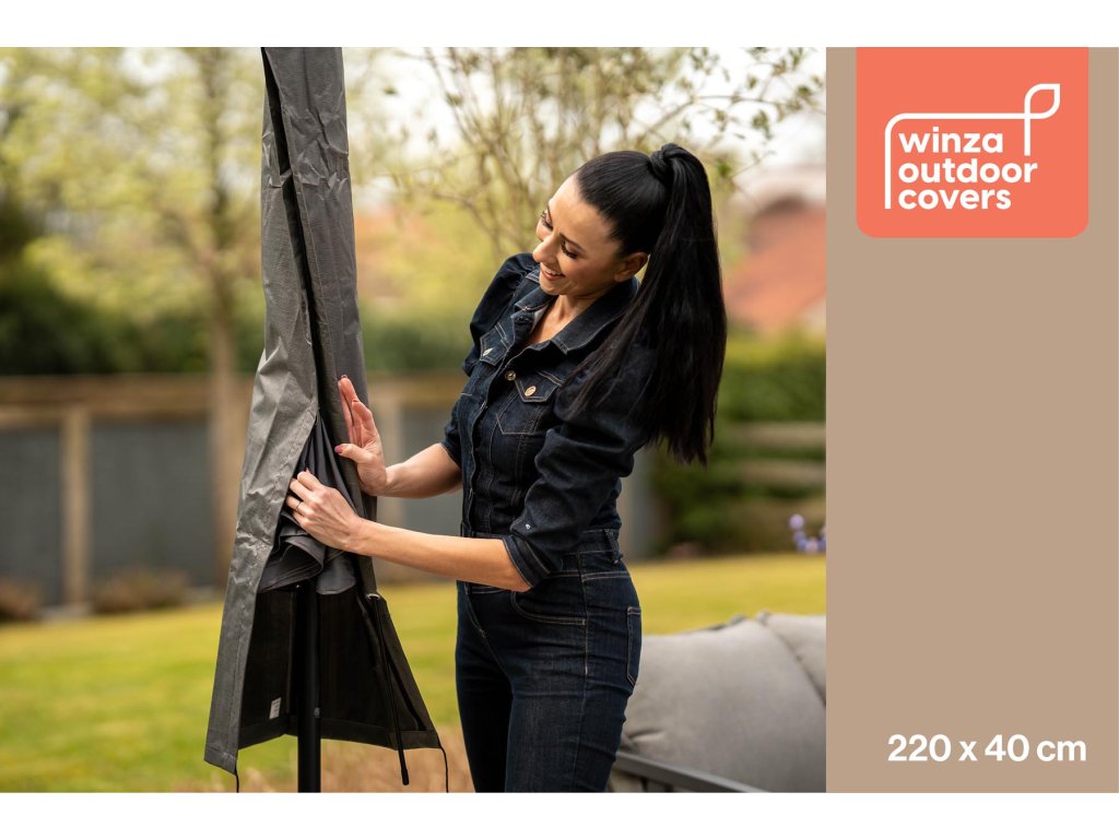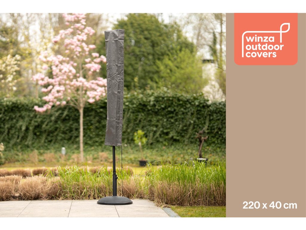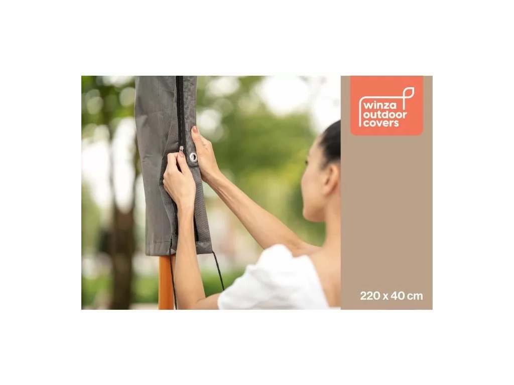 S rozměry 220x40 cm je obal Winza vhodný pro většinu standardních slunečníků. Snadno se nasazuje a utahuje pomocí suchého zipu, což zajišťuje pevné uchycení a ochranu slunečníku před prachem, deštěm a UV zářením.