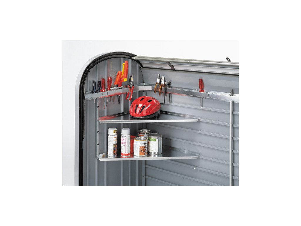 Rohová souprava polic s regálovým nosníkem, 5x výškově nastavitelné, montovatelné volitelně vpravo, anebo vlevo.