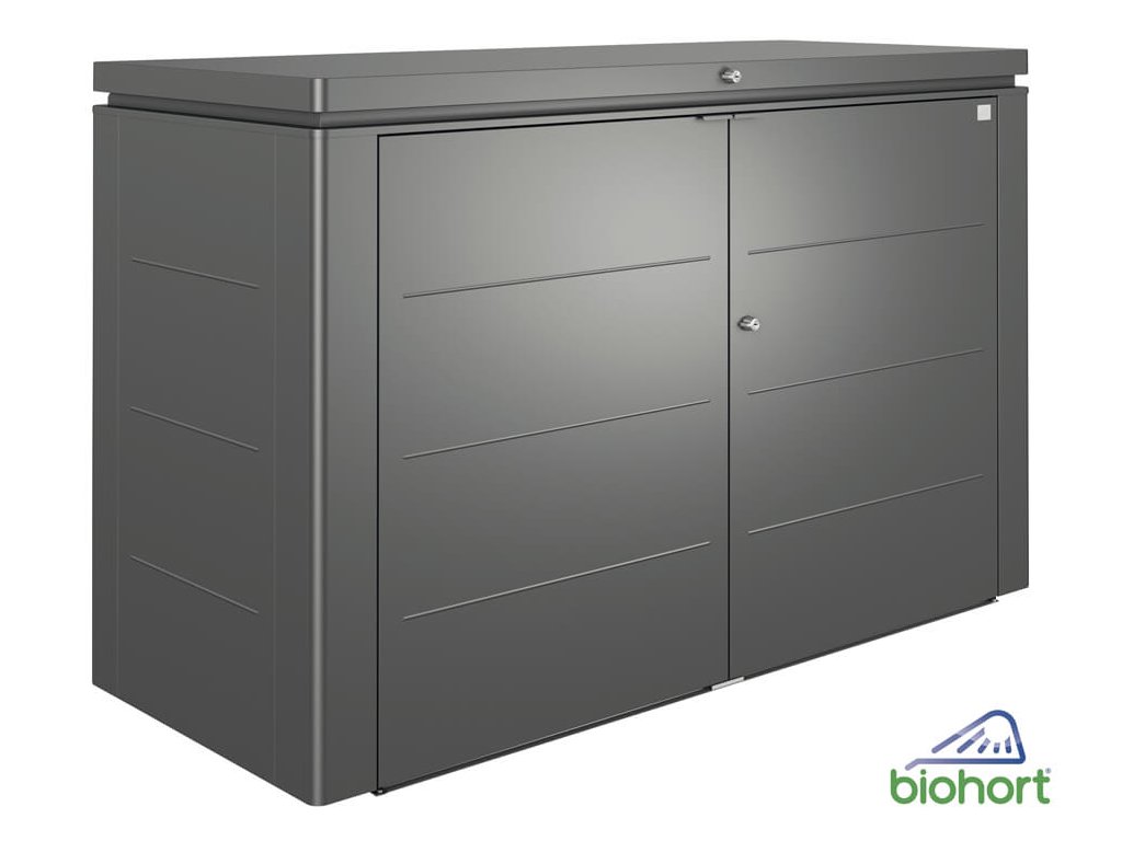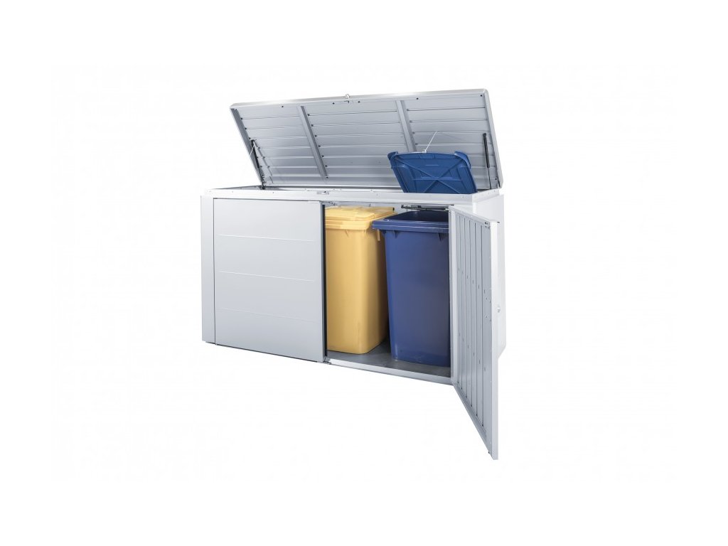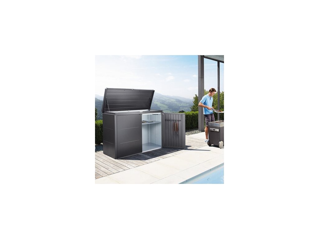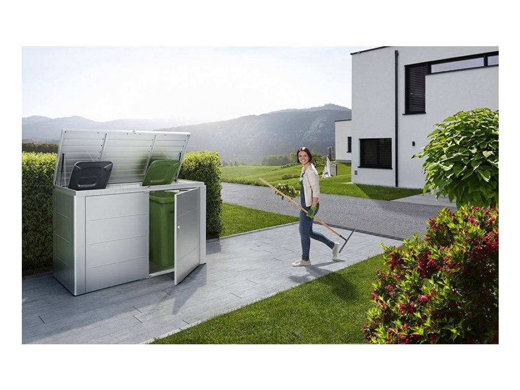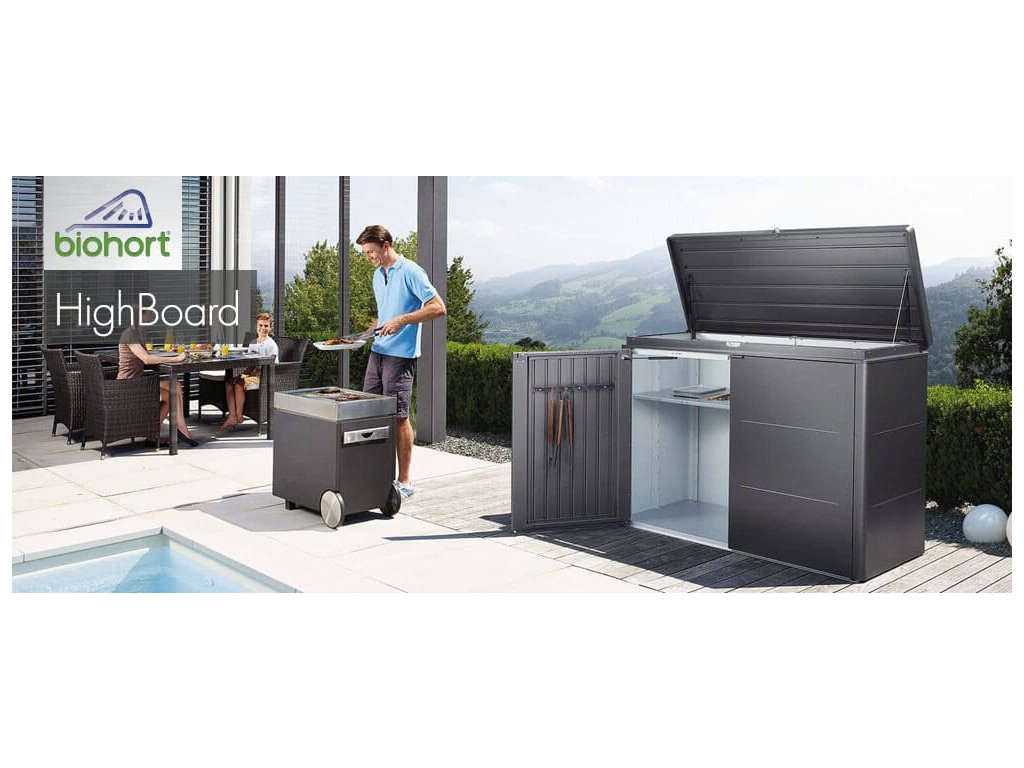 HIGHBOARD má mnohoraké využití. Odkládací prostor na zahradní příslušenstvo, skládací nábytek, ale i nádoby na odpad. Odpadkové koše neposkytují pěkný pohled, avšak víte je schovat do praktického dizajnového boxu. Křídlové dveře a poklopový otvor umožňují lehce manipulovat s uskladněnými věcmi a nádobami. Robustní uzavíraní s cylindrickým zámkem zabezpečí, aby se dovnitř nedostali venkovní nečistoty.